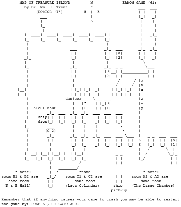 A text-based map by William Trent showing the Eamon adventure The Caves of Treasure Island by Paul Braun and Geoffrey Genz. |