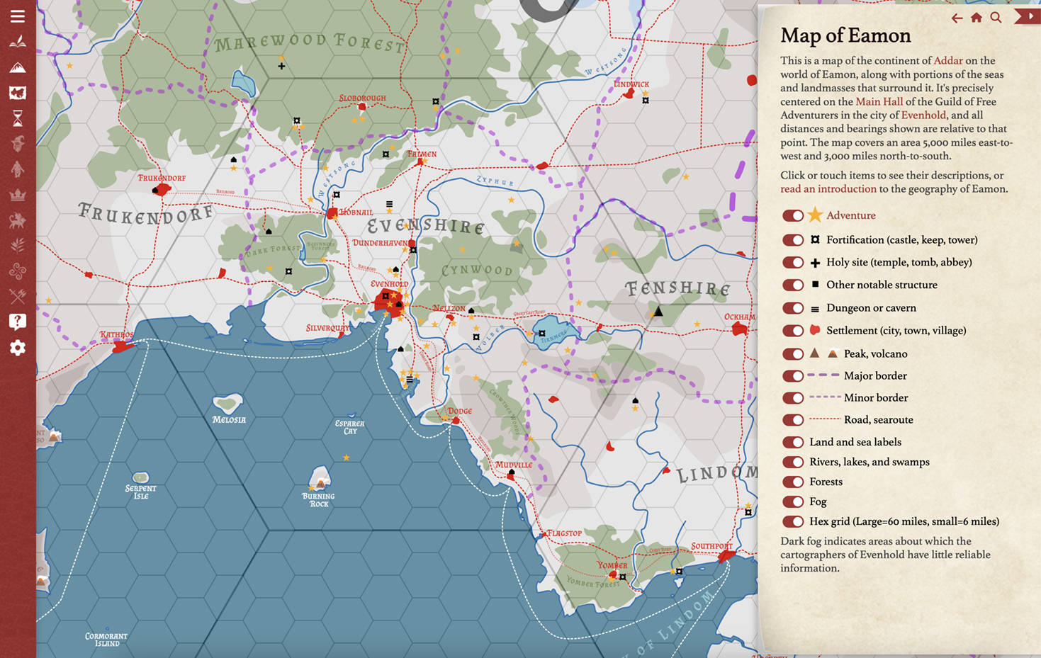 | current | 19:59, 10 April 2026 | 1,469 × 929 (902 KB) | Huwmanbeing (talk | contribs) | {{Information |description = Screenshot of The Adventurer's Guide to Eamon by Huw Williams showing the interactive world map. |source = "The Evergreen World of Eamon''" |date = February {{Year|2025}} |author = Huw Williams |license = {{Permitted}} }} Category:Website screenshots |