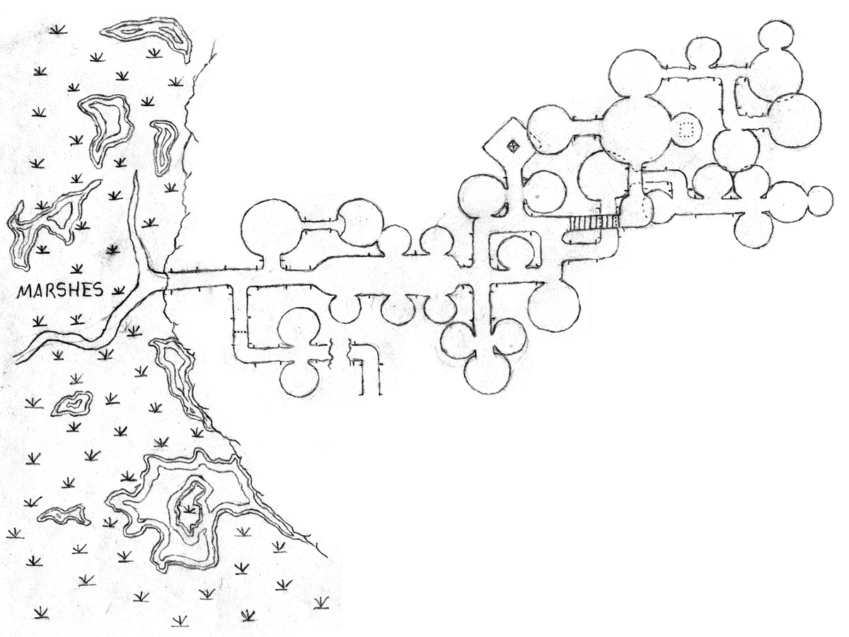 A hand-drawn map made by Huw Williams sometime in the late 1980s for an unreleased homemade Eamon adventure. About 75 rooms are mapped, unlabeled but seemingly representing caverns or tunnels situated east of some marshes. |