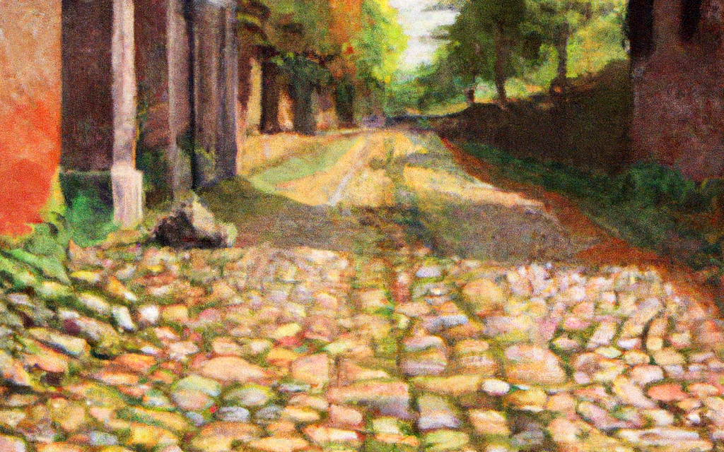 Artwork of roads created by the DALL-E 2 digital image generator. The prompt was: "Painting of a Medieval stone road in the country, in the style of Vermeer". |