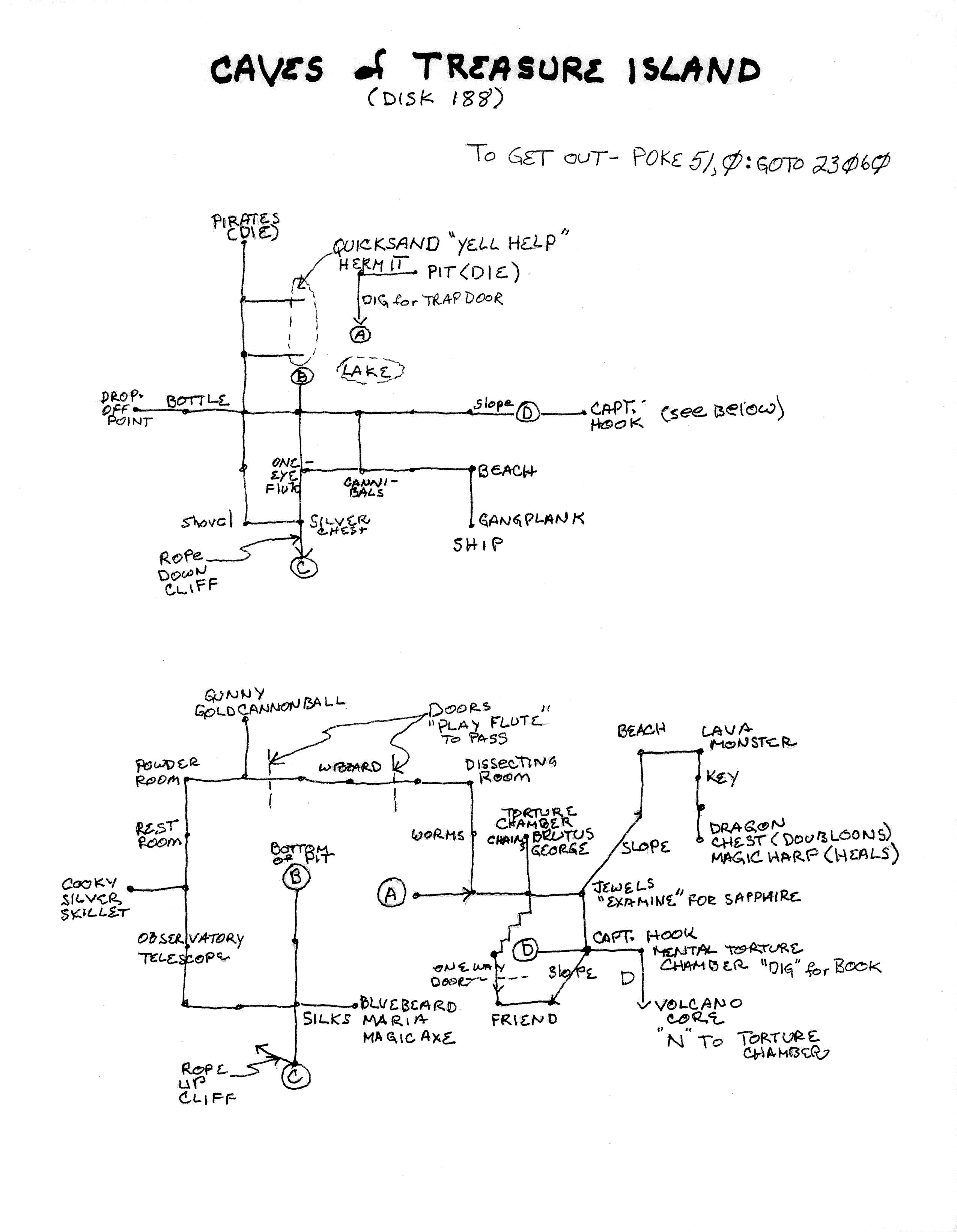 Hand-drawn map of Braun and Genz's Eamon adventure The Caves of Treasure Island. |