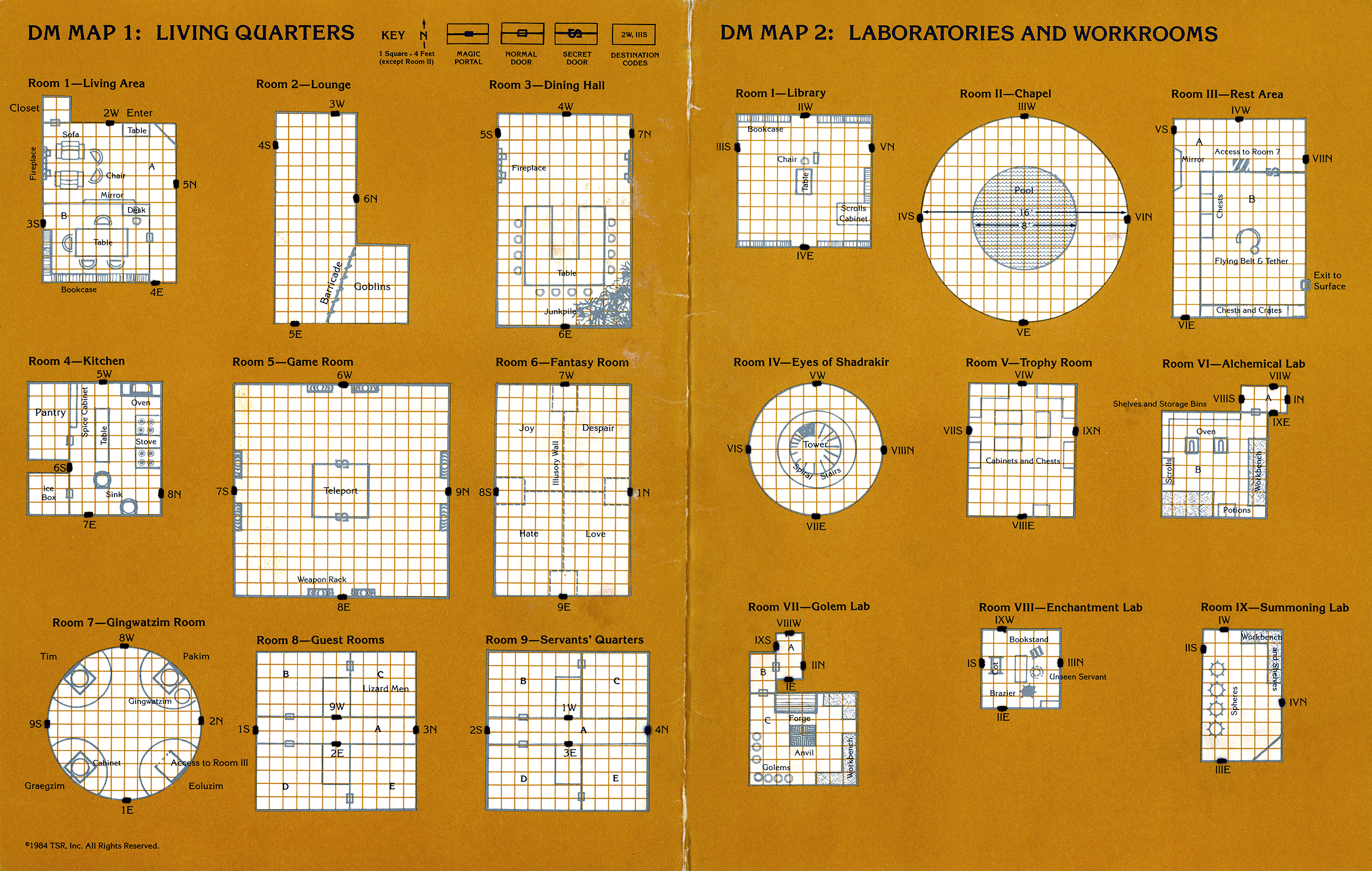 Map pages from the front and back covers of the 1984 AD&D module The Lost Island of Castanamir by Ken Rolston, published by TSR. Robert Davis adapted the module for the 1990 Eamon adventure The Lost Isle, and Huw Williams copied the visual style when creating a new map for the Eamon Wiki in 2021. |